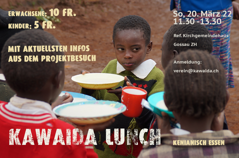 Wir laden alle ganz herzlich zu einem afrikanischen Mittagessen von 11.30 – 13.30 Uhr im reformierten Kirchgemeindehaus in Gossau / ZH ein. Für einen Betrag von CHF 10.- für Erwachsene / CHF 5.- für Kinder können typische kenianische Speisen gekostet werden. Nach dem Essen informieren wir alle Interessierten über den aktuellen Stand des Projekts Kawaida. Für die Kinder stehen Malsachen und Spiele bereit. Zudem haben die Kinder die Möglichkeit Päckli zu fischen. Voranmeldungen bis 4. April an: erleichtern uns die Planung. Alle spontan Entschiedenen sind ebenfalls herzlich willkommen! Der Erlös aus dem Essen fliesst in das Projekt Kawaida www.kawaida.ch. Wir freuen uns auf euch!